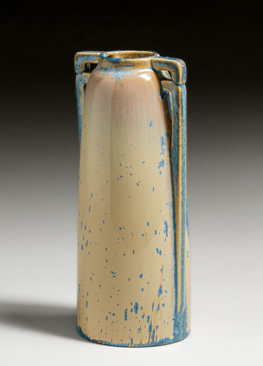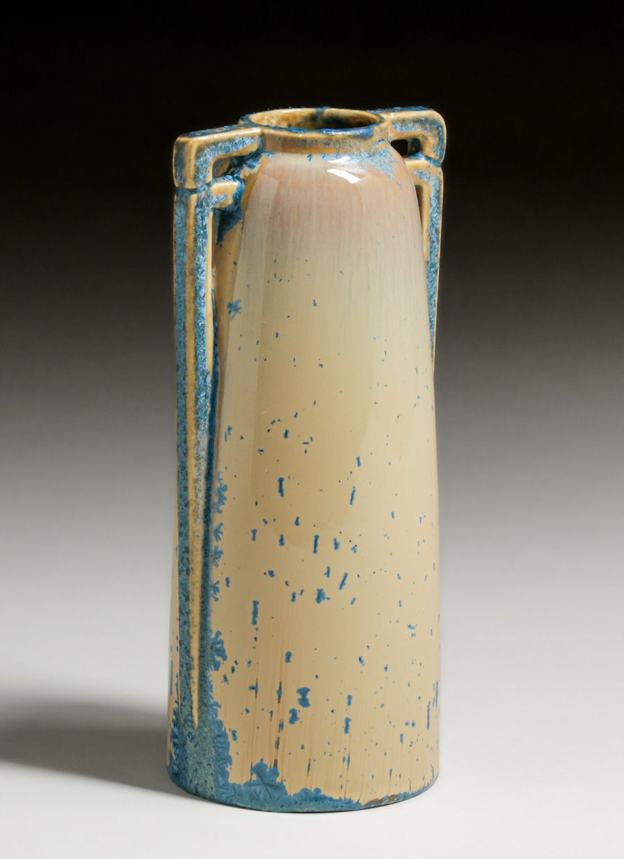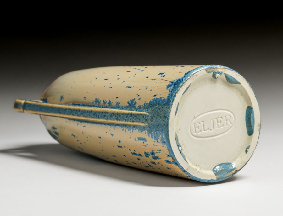 Eljer Pottery – Ford City, PA Two-Handled Blue Crystalline Vase c1920s. Elder was a manufacturer of porcelain sinks and toilets. At some point they experimented with a line of Art Pottery vases. Approximately only 50 to 100 pieces of Art Pottery were produced. Signed. Perfect condition. 9″h x 4″w $950