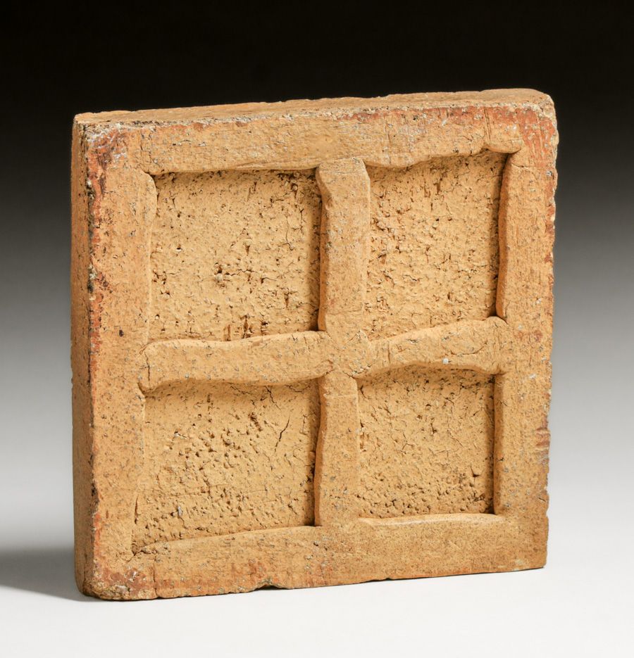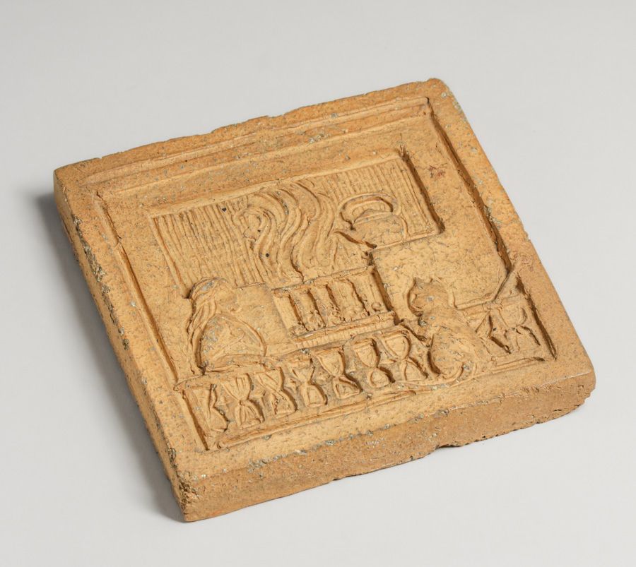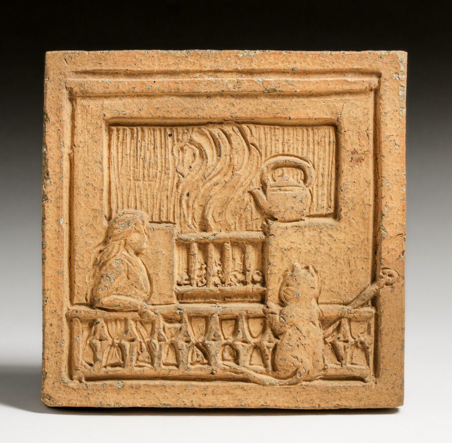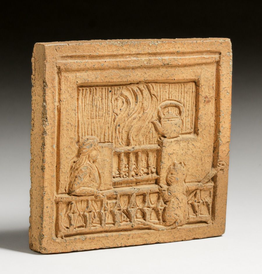 Grueby Nursery Rhyme Tile c1905. Possibly Polly Put the Kettle On - Nursery Rhyme. Unsigned. Minor abrasions. 6 7/8"w x 6.75"h $950