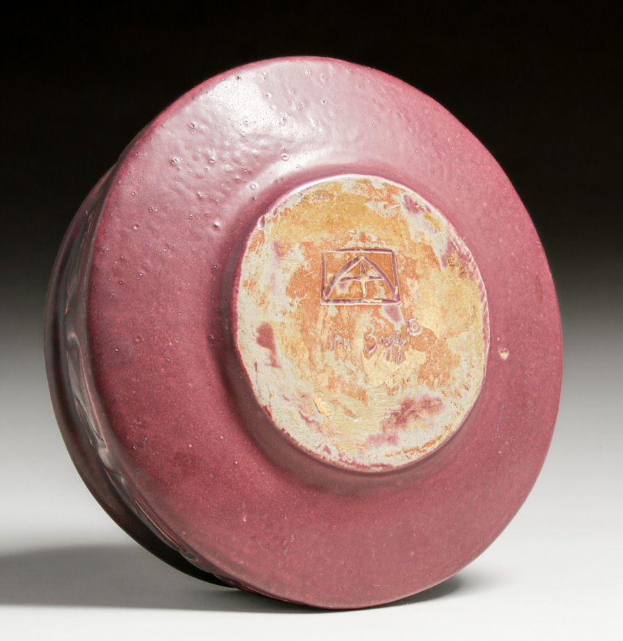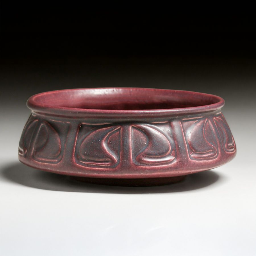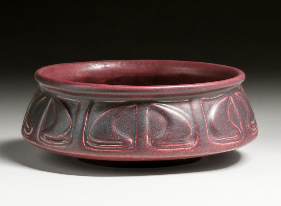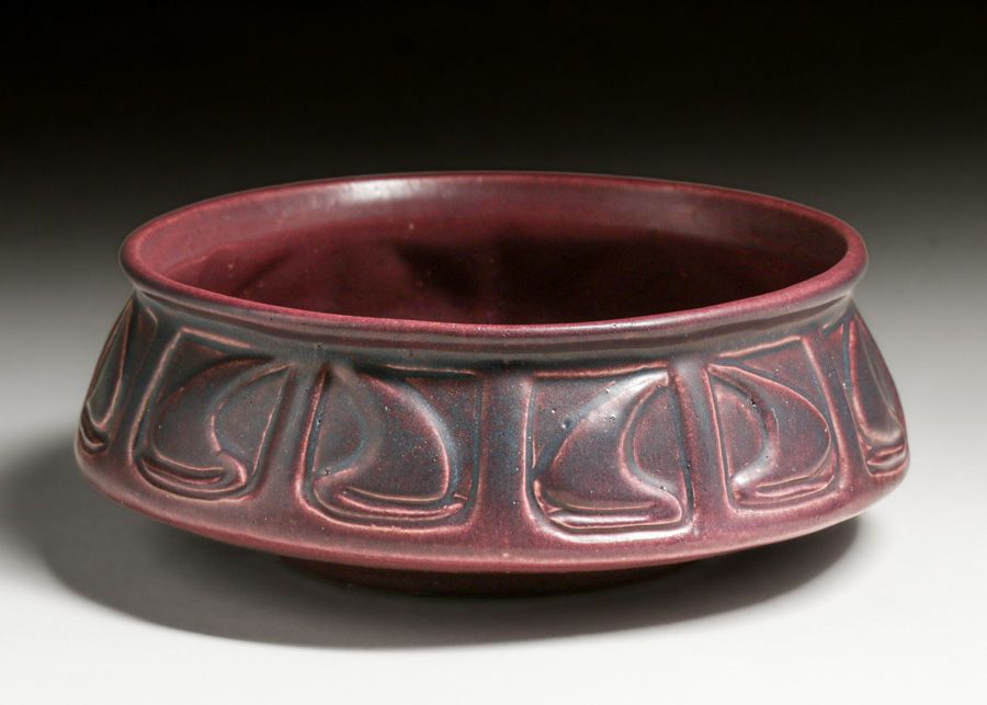 Van Briggle Matte Glazed Carved Bowl c1915-1920. Signed. Earlier red clay. Perfect condition. 8.75"d x 3.25"h $650