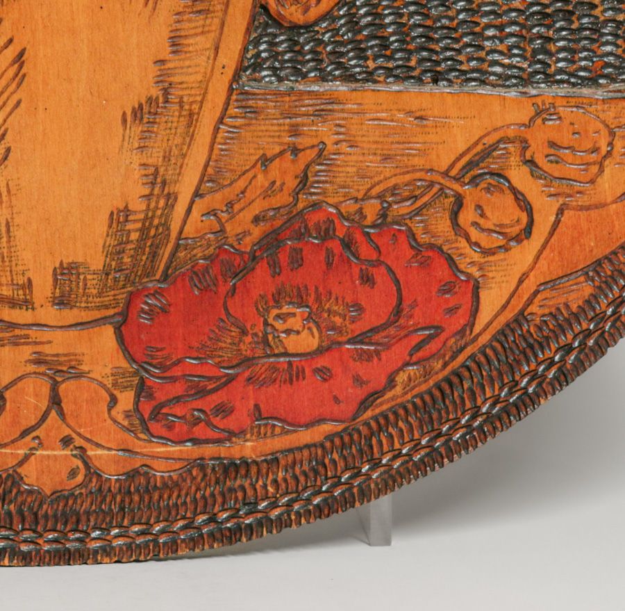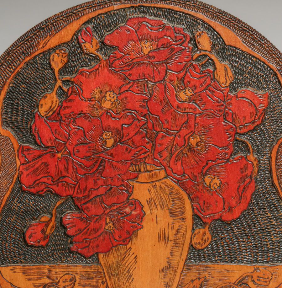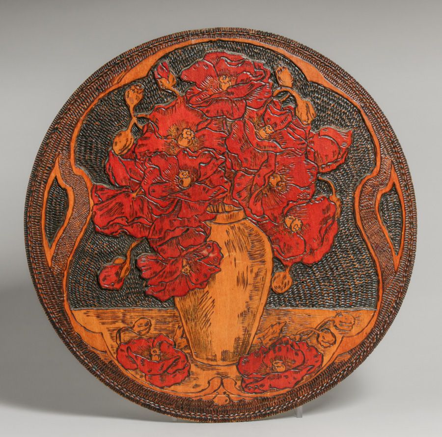 Flemish Art Co - New York Pyrography Carved & Painted Roses Plaque c1900s. Signed. Excellent original condition. 17.75"d $750