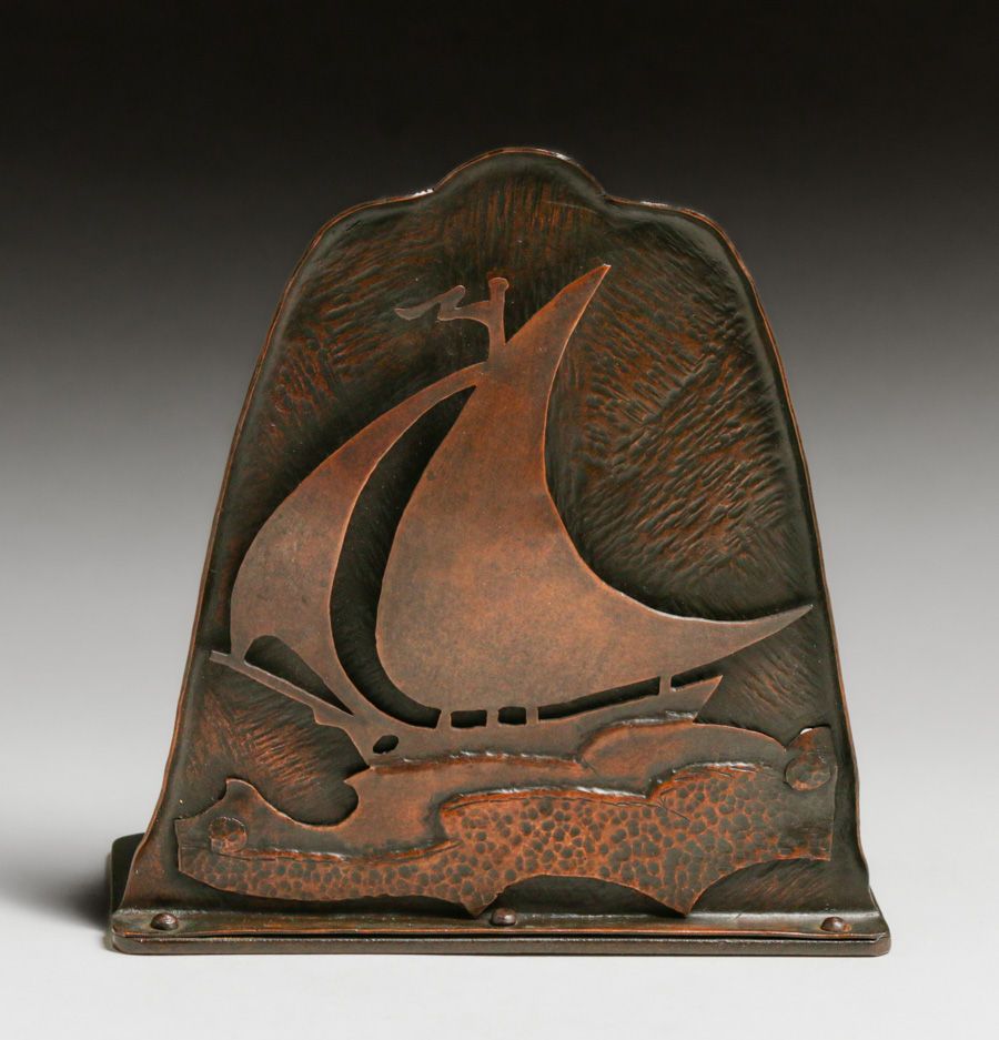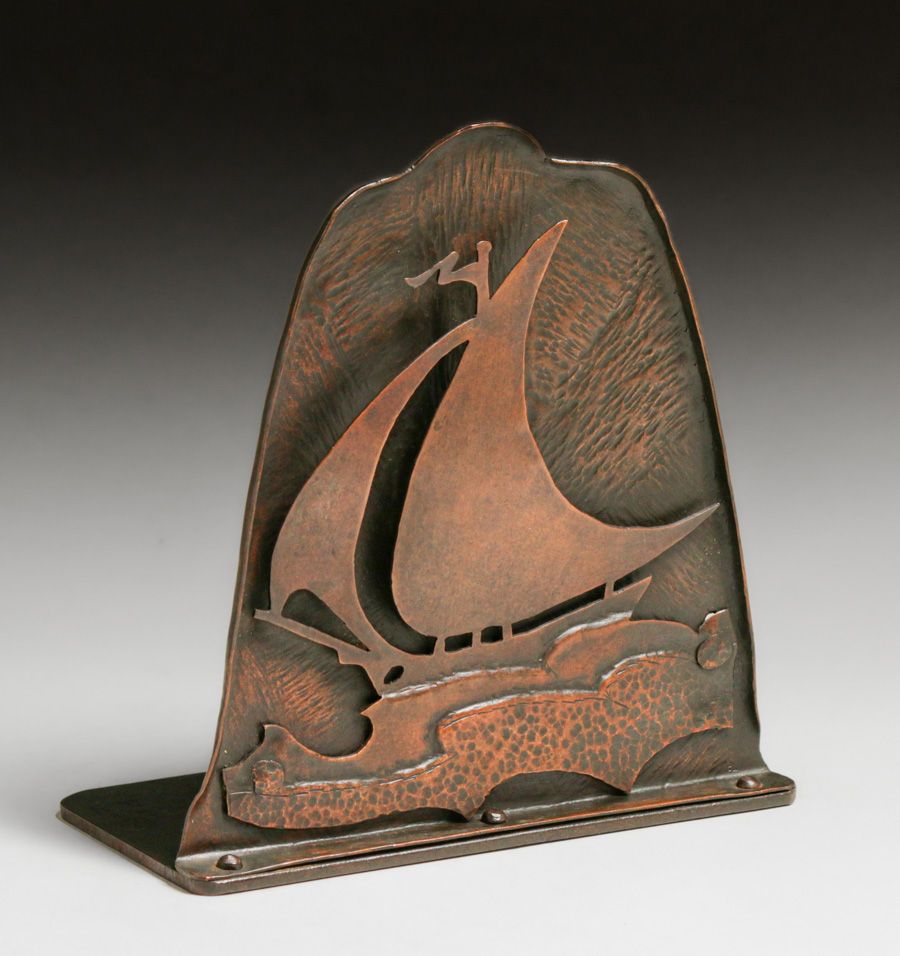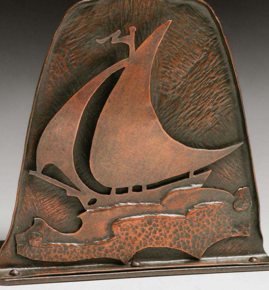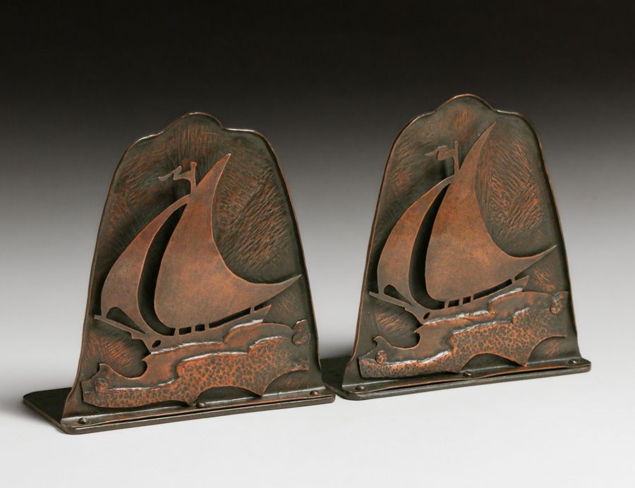 Arts & Crafts Period Hammered Copper & Raised Cutout Sailing Ship Bookends c1910s. Unsigned. Excellent new patina. 6.25"h x 6"w $550 pair