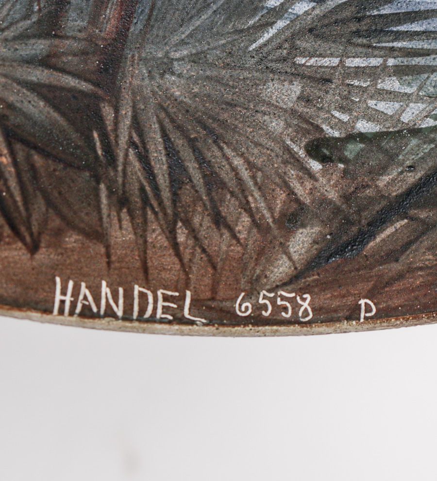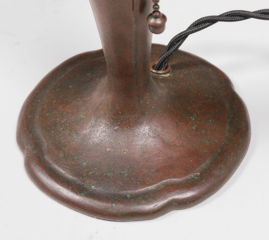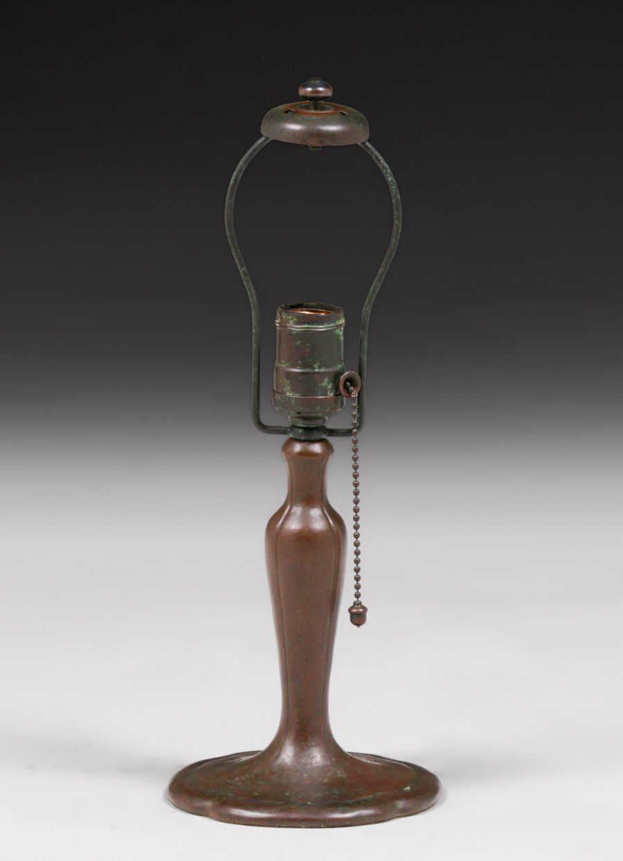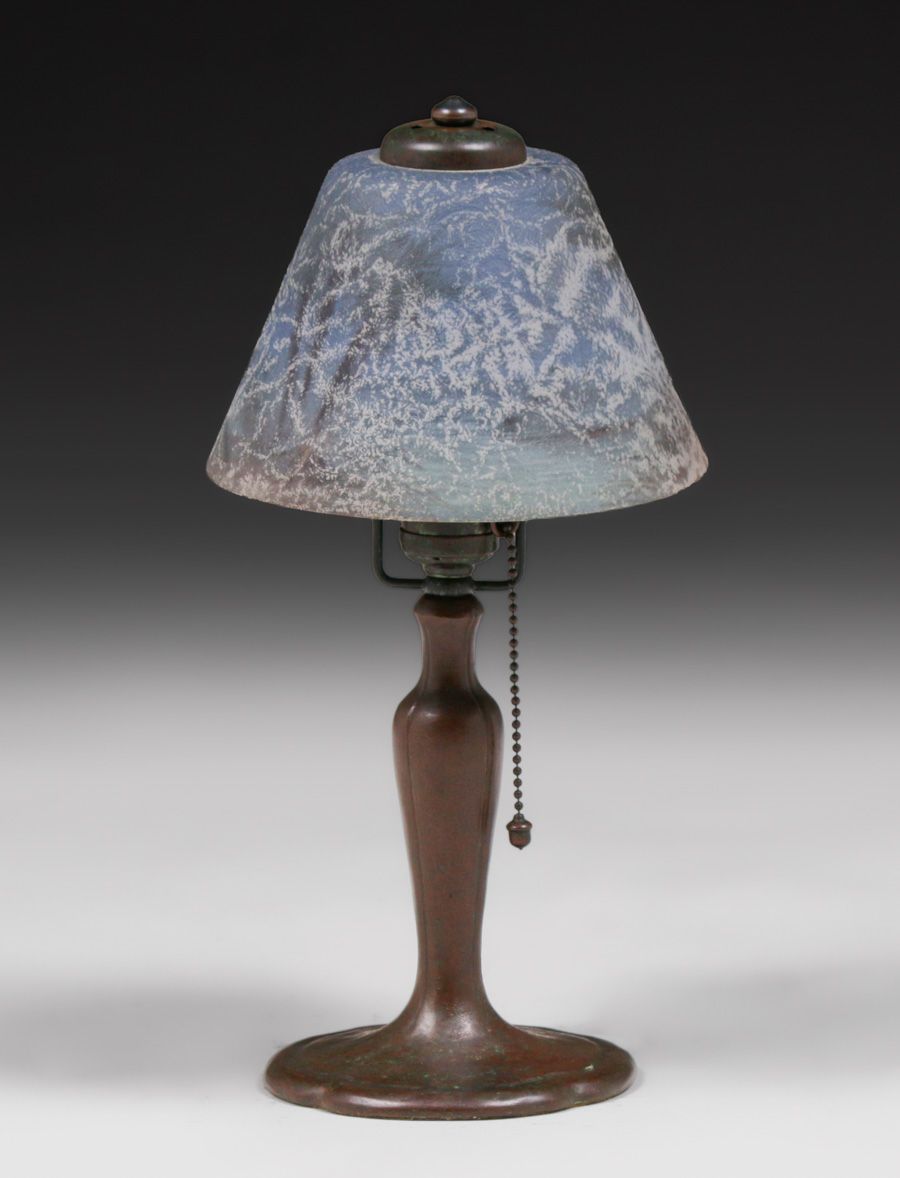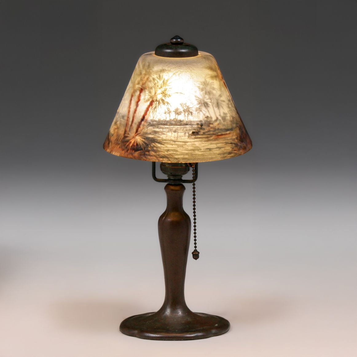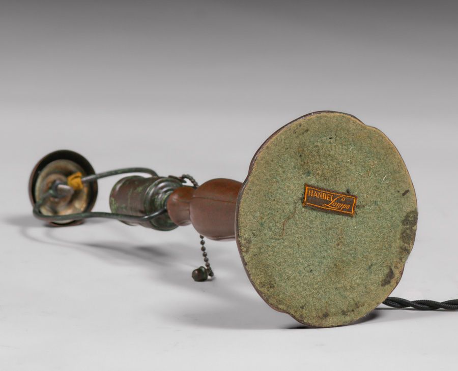Handel #6558 Reverse-Painted Boudoir Lamp c1910. Signed. Excellent original patina. Original reverse-painted glass in perfect condition. 13.75"h x 6.75"d $3200