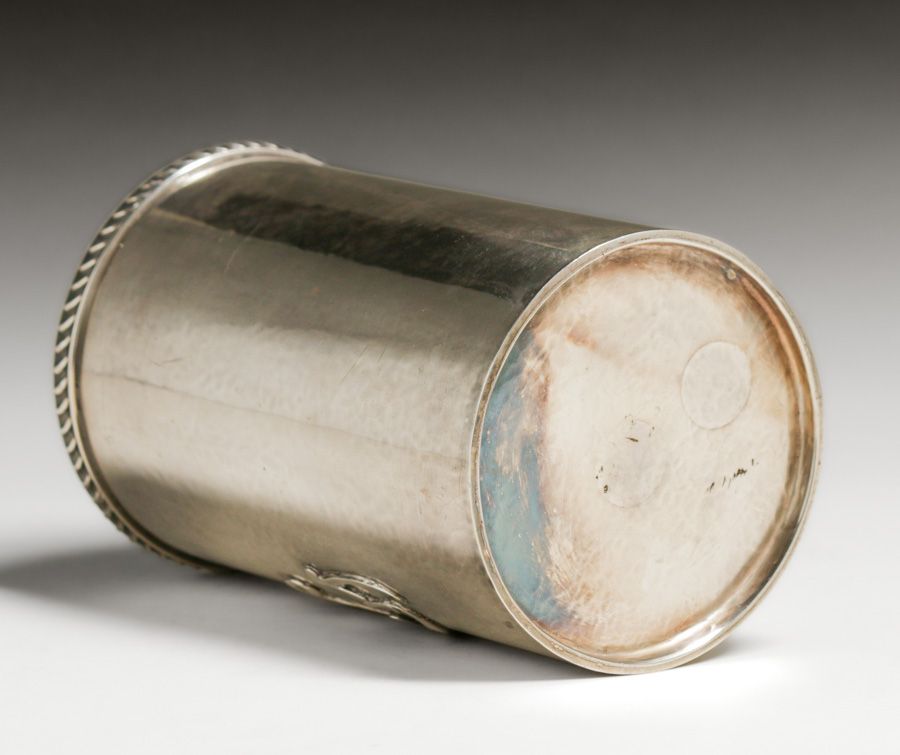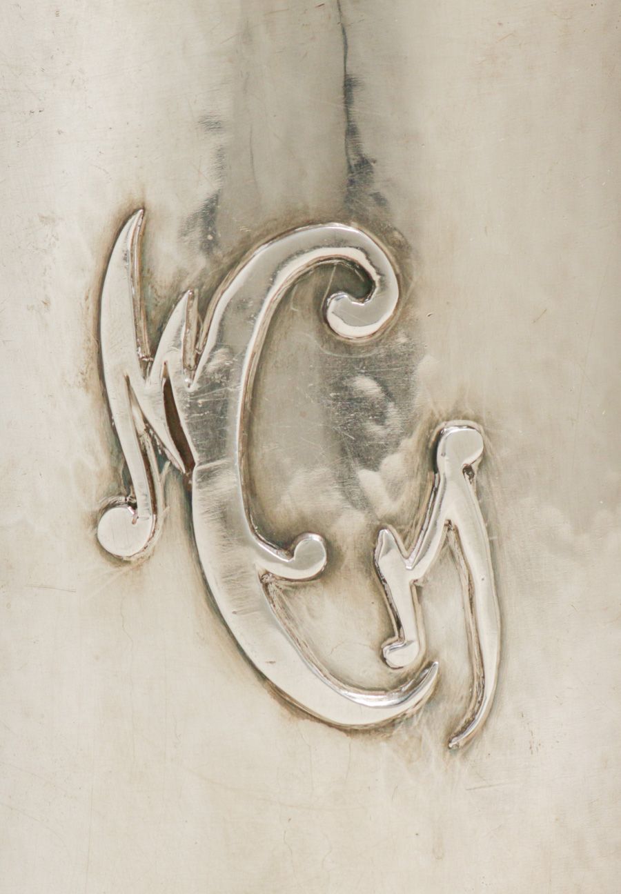 Agatha van Erp Student Silver-Plated Hammered Copper Vase 1940. Signed inside vase with students initials "JMC"? and 1940. Excellent condition. Agatha taught metal working classes at Metalcraft in San Francisco during the 1930s and then brought classes into her home on Vallejo St about 1940. Just before each annual show, Agatha would re-hammer her students work so it presented perfectly. This is why her student work looks so perfect. $750
