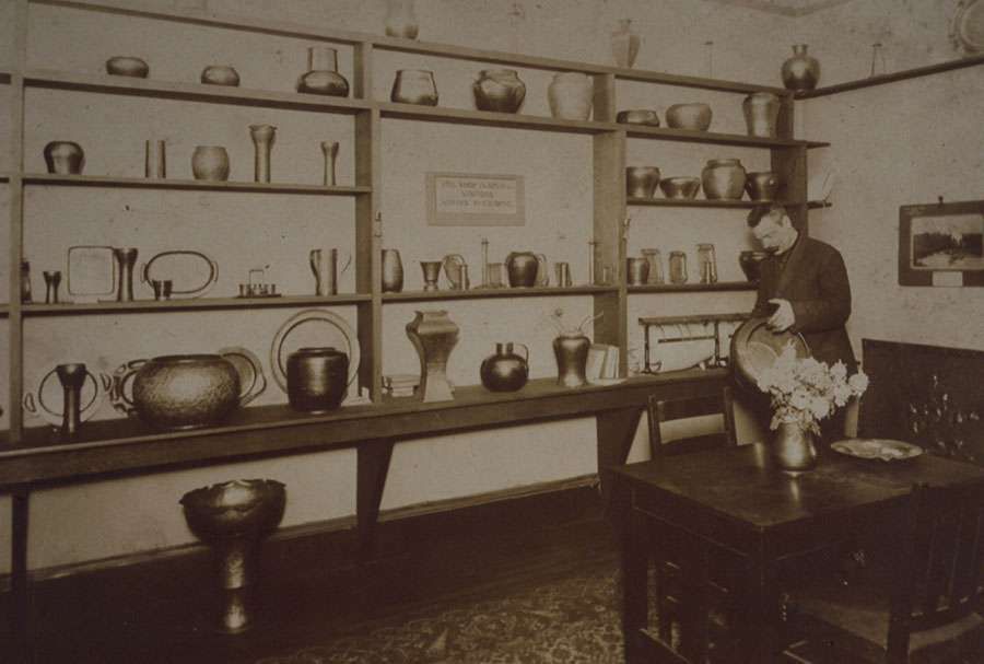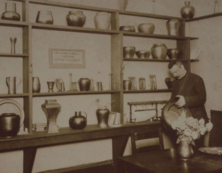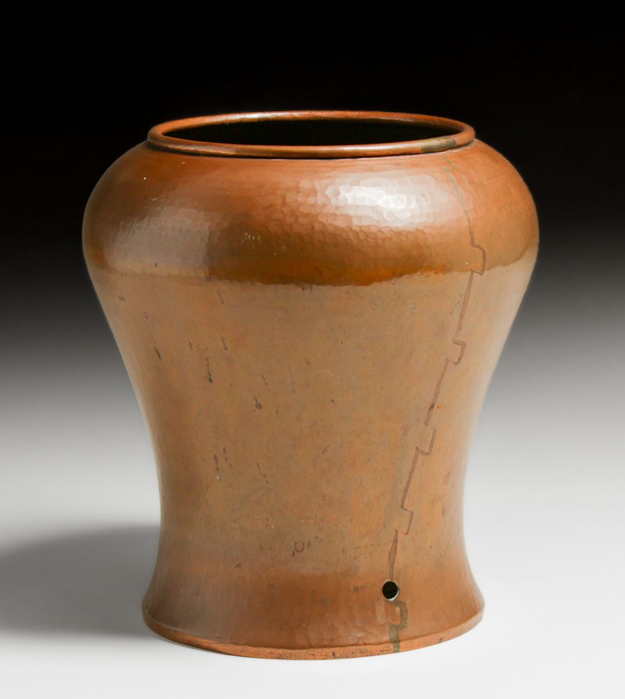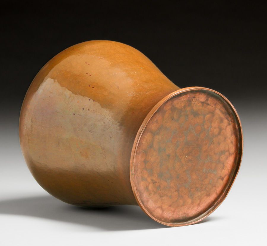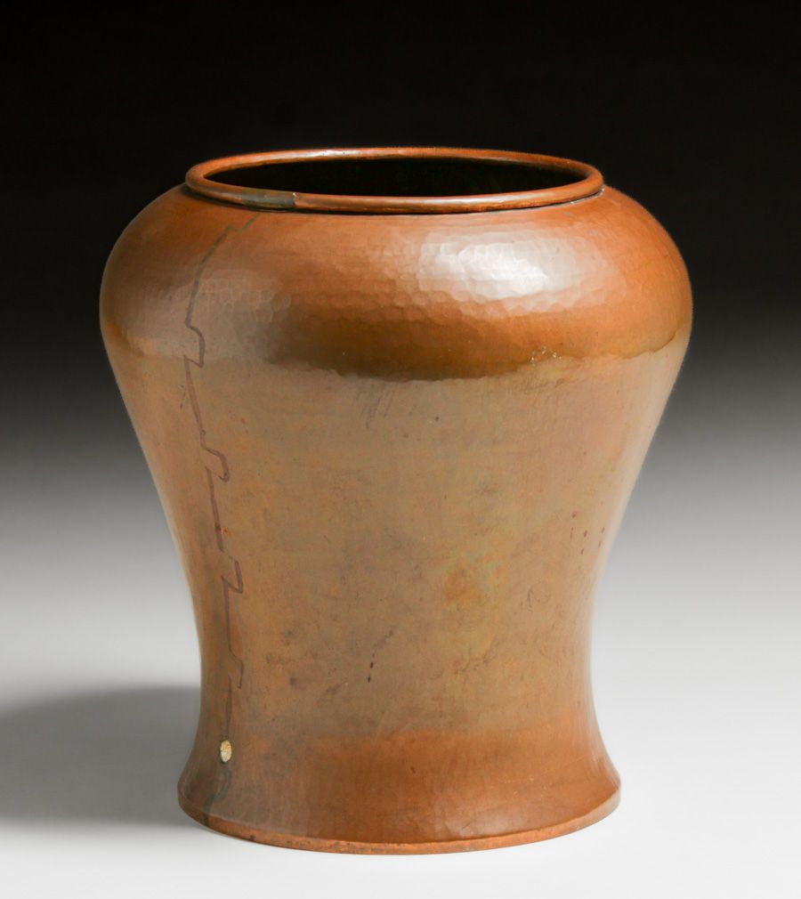 Early Dirk van Erp Hammered Copper Lamp Base Vase c1909. Unsigned. Similar form pictured in the November 1909 photograph of Dirk van Erp in the D'Arcy Gaw - Dirk van Erp Studio as a lamp base on the lower shelf in front of van Erp. Excellent original patina. 9.75"h x 7.75"d $7500